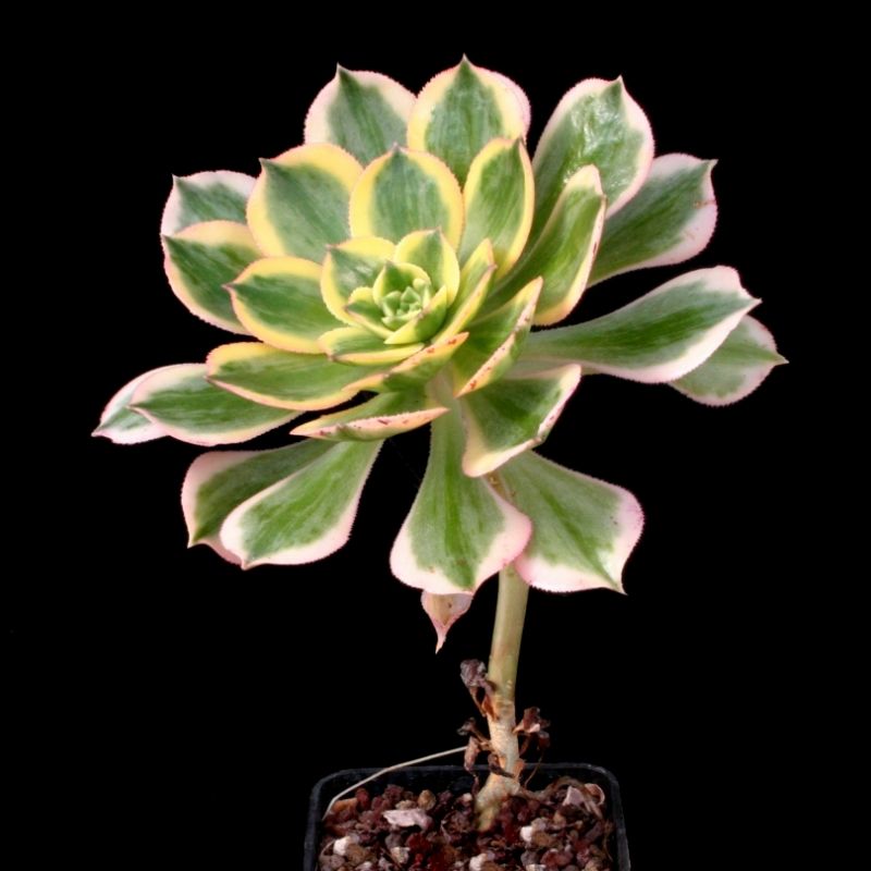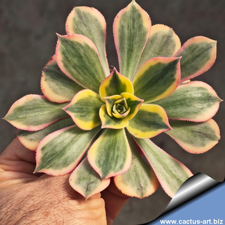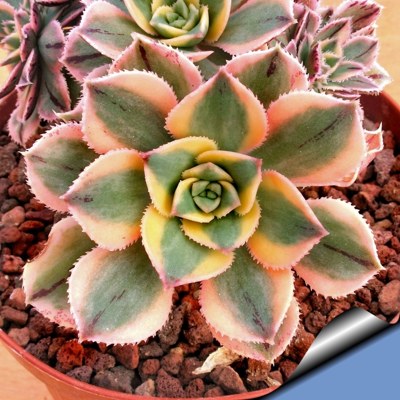 Cultivar variegato molto apprezzato per le rosette larghe e piatte, composte da foglie carnose sfumate in delicate tonalità “pastello” che ricordano un acquerello: crema e lime al centro, rosa sui margini, con un leggero sottotono verde-mela. I colori si esaltano notevolmente con un’illuminazione intensa.