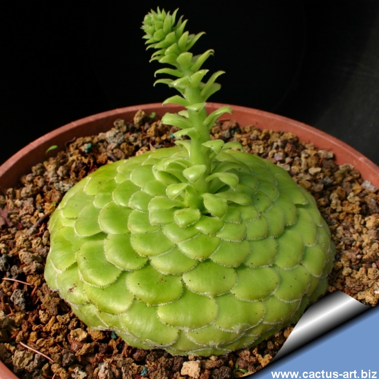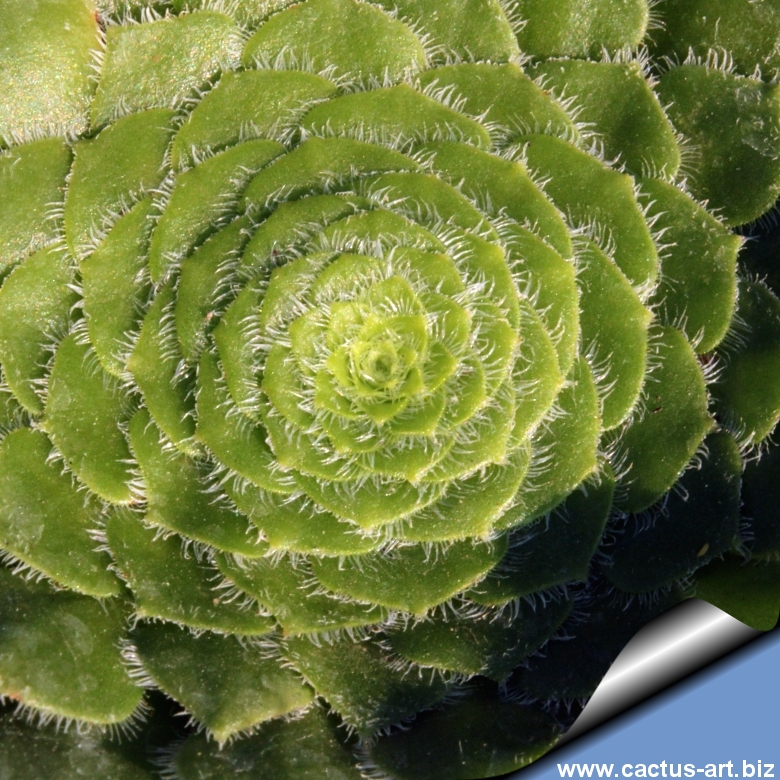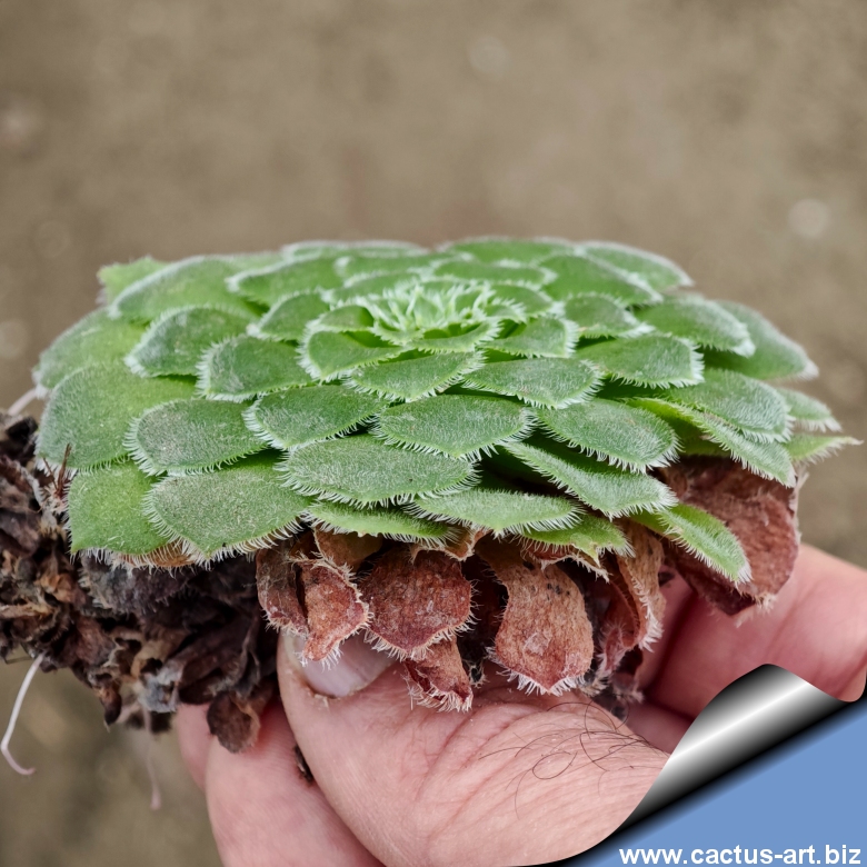 Rosetta fortemente appiattita con foglie perfettamente sovrapposte e margini dai sottili peli bianchi. Endemica dei versanti lavici ombrosi di Tenerife. Richiede protezione dal sole diretto.