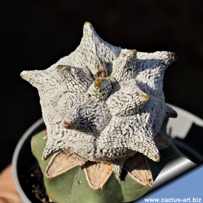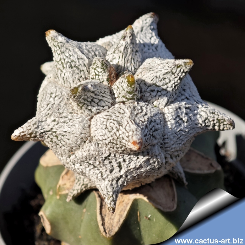 # # PIANTA SPECIALE # # # (Esemplare selezionato) – Diametro 5,5 cm. Pianta straordinaria con tubercoli piramidali (KIKKO) e larghi puntini bianchi (SNOW). Una combinazione rara di tratti estetici giapponesi, ricercata per la simmetria, purezza del colore e forma scultorea.