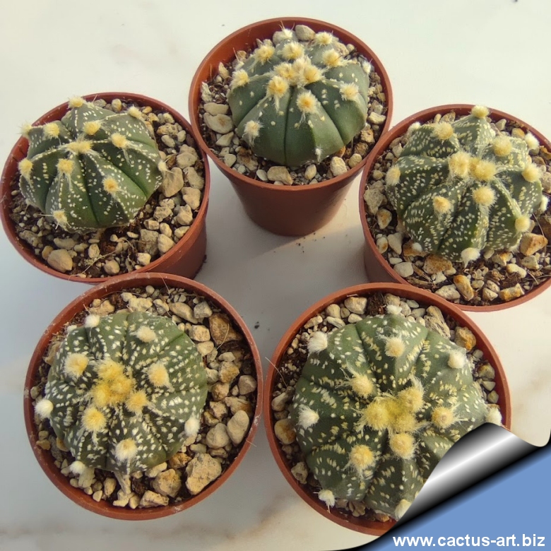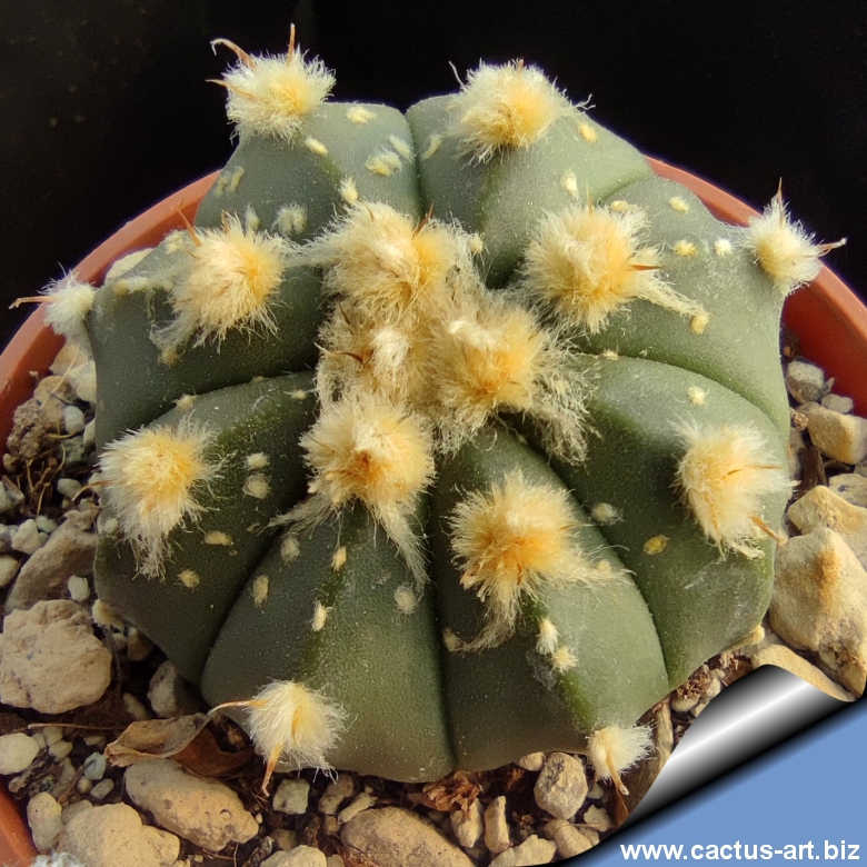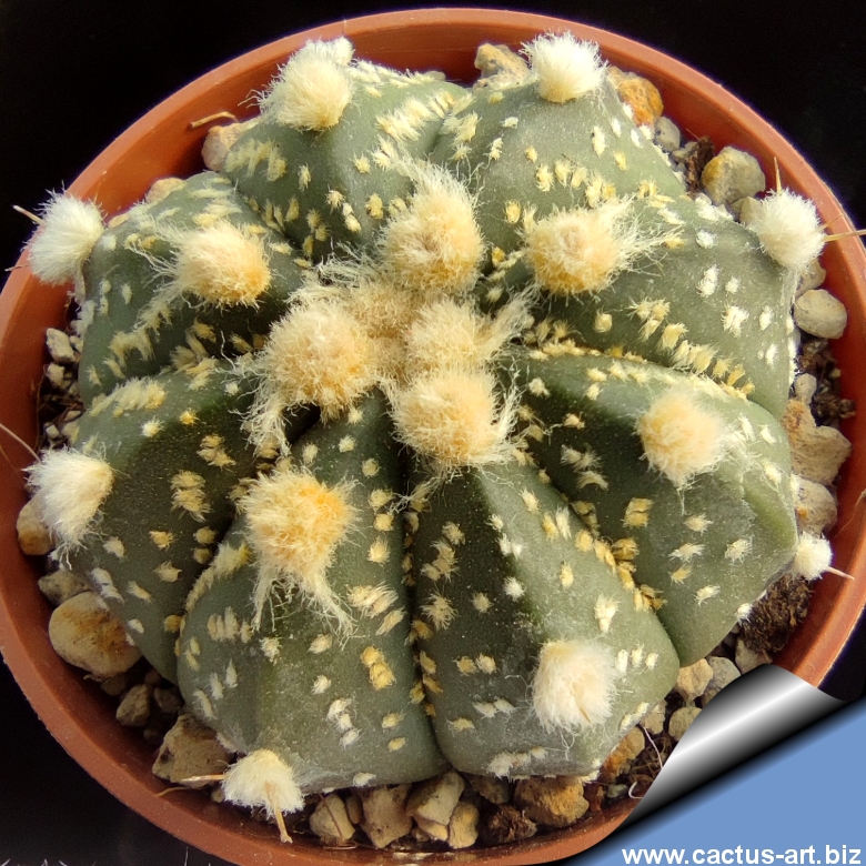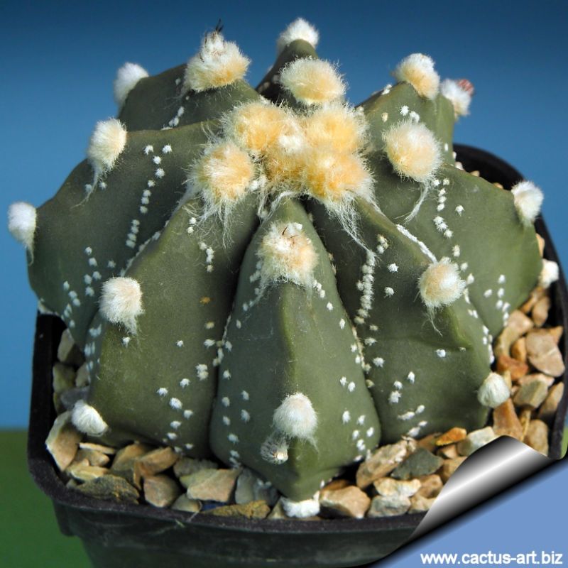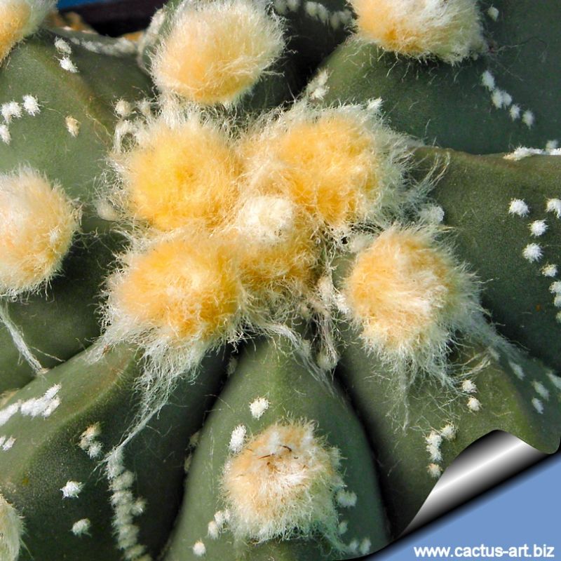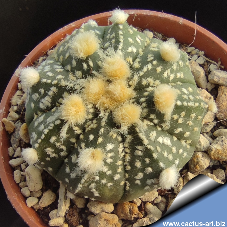 Plants obtained by controlled pollination of ♀Astrophytum asterias x ♂Astrophytum senilis aureum. Ribs sharp with very short spines and yellow woolly areoles. As the plant ages the areoles become more and more large, woolly and colourful.