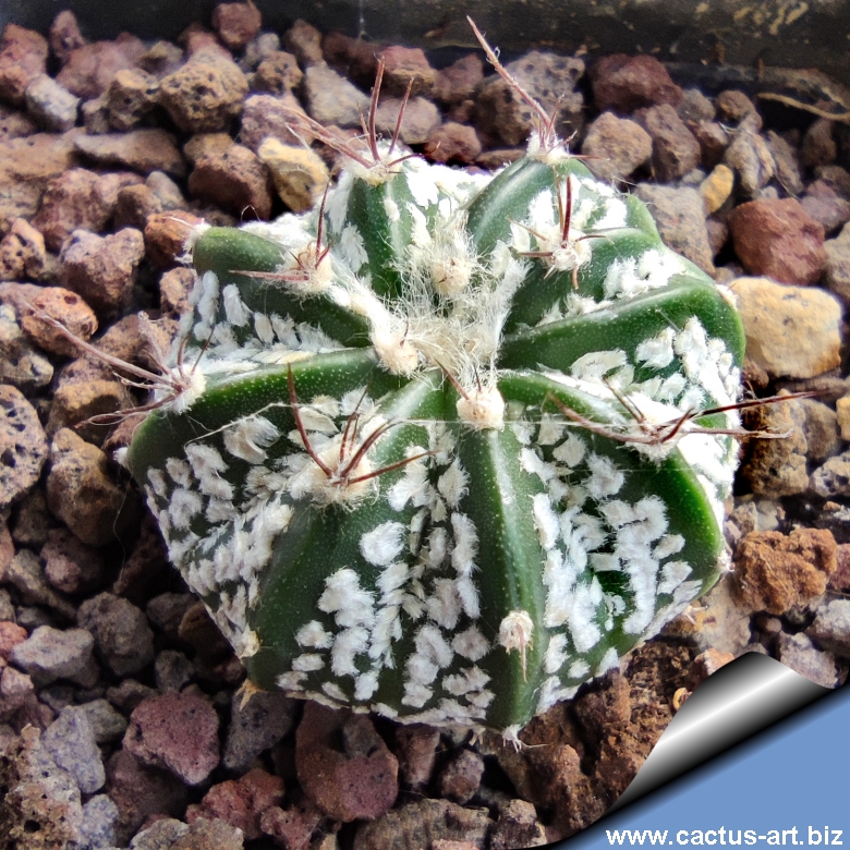 Hybrid A. asterias 'Superkabuto' x A. capricorne. This hybrid inherited large white spots from “Superkabuto”.The ribs are also noticeably raised, clearly indicating kinship with A. capricorne. The flower are also very beautiful.
