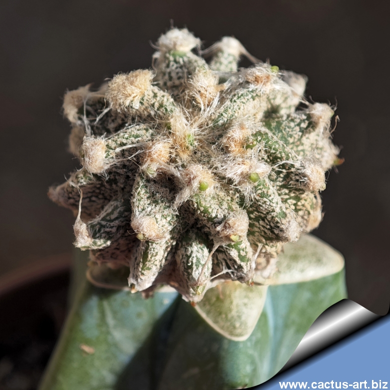 Cultivar giapponese riconoscibile per i tubercoli piramidali allungati, più o meno arrotondati, disposti in uno schema geometrico unico. La struttura scultorea e l’assenza di spine lo distinguono nettamente all’interno del gruppo Myriostigma.