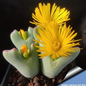 Questa è la forma compatta e più piccola di Conophytum lacteum, una rara variante a fiore bianco di C. bilobum. I petali immacolati contrastano con il corpo verde-glauco. Fioritura autunnale.
