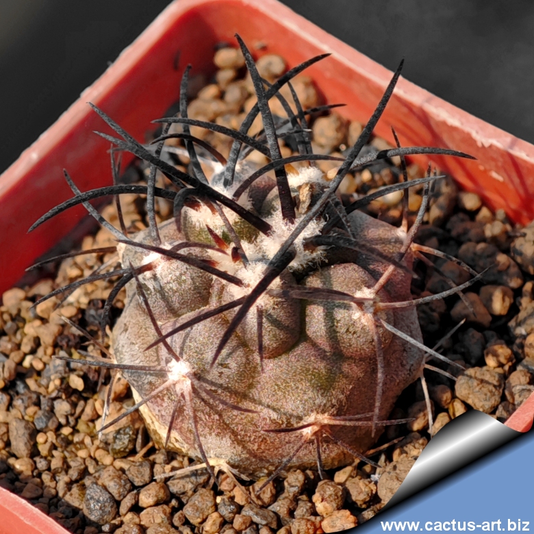 Questa è la rara forma di montagna di Copiapoa griseoviolacea, la più bella e caratteristica. Presenta un corpo sferico bruno-violaceo e fitte spine nerissime, robuste ed elegantemente arcuate. Pianta di grande valore botanico.
