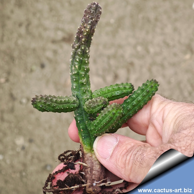 Piccola succulenta ramificata dalla alla base. Steli cilindrici verde-brunastri con tubercoli apicali bianchi. Da fine estate a inizio autunno, produce numerosi piccoli fiori imbutiformi bruno-violacei con gola gialla vicino agli apici.