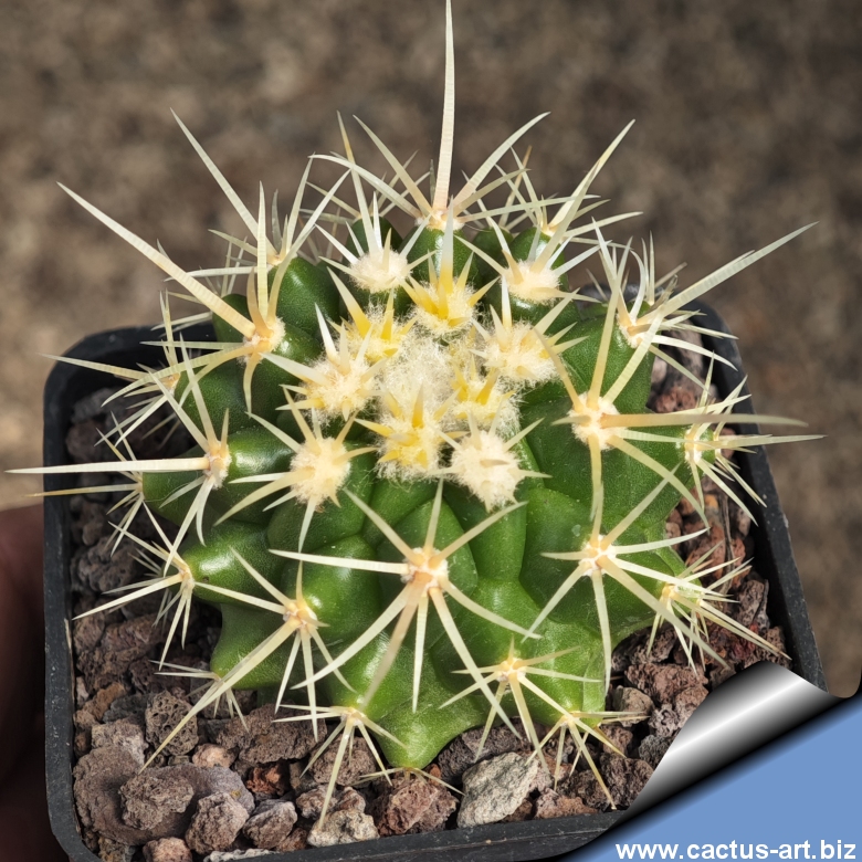 Questa è la vera forma intermedia originale di Echinocactus grusonii, diversa dalla comune varietà commerciale. Ha spine più corte di un grusonii classico e, a differenza di quelle ricurve che si trovano in commercio, queste sono perfettamente diritte.
