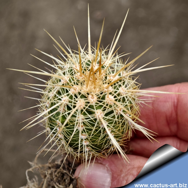 Fusto cilindrico con lunghe spine giallastre, che ramifica dalla base creando piccoli cespi. I grandi fiori, di un intenso magenta, spiccano vivacemente sulle spine chiare.
