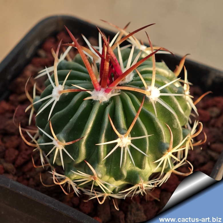 Cactus sferico con coste dai margini ondulati. Areole bianche con 5-12 spine, la superiore appiattita e larga, di colore rosso-bruno. In primavera produce fiori giallo pallido-rosa, con una striatura porpora-rossastra su ogni petalo.