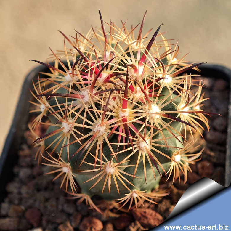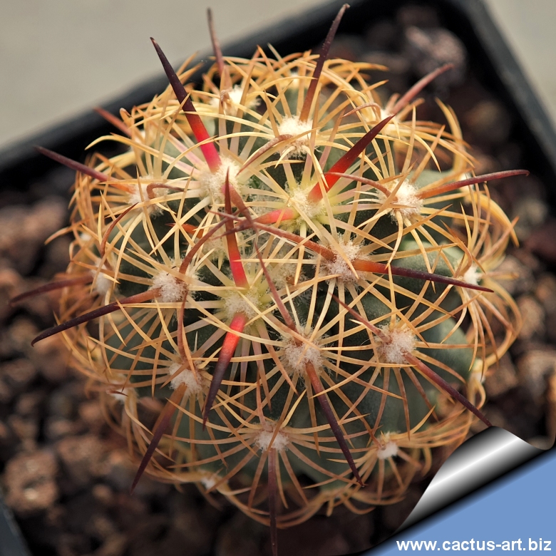 Cactus solitario, globoso. Spine radiali bianche o grigio-bluastre all’apice, grigie con l’età. Quattro spine centrali più robuste, aciculari, con apici bruno-neri, rivolte verso l’alto; l'inferiore è ricurva, robusta, orientata in basso e all’esterno.