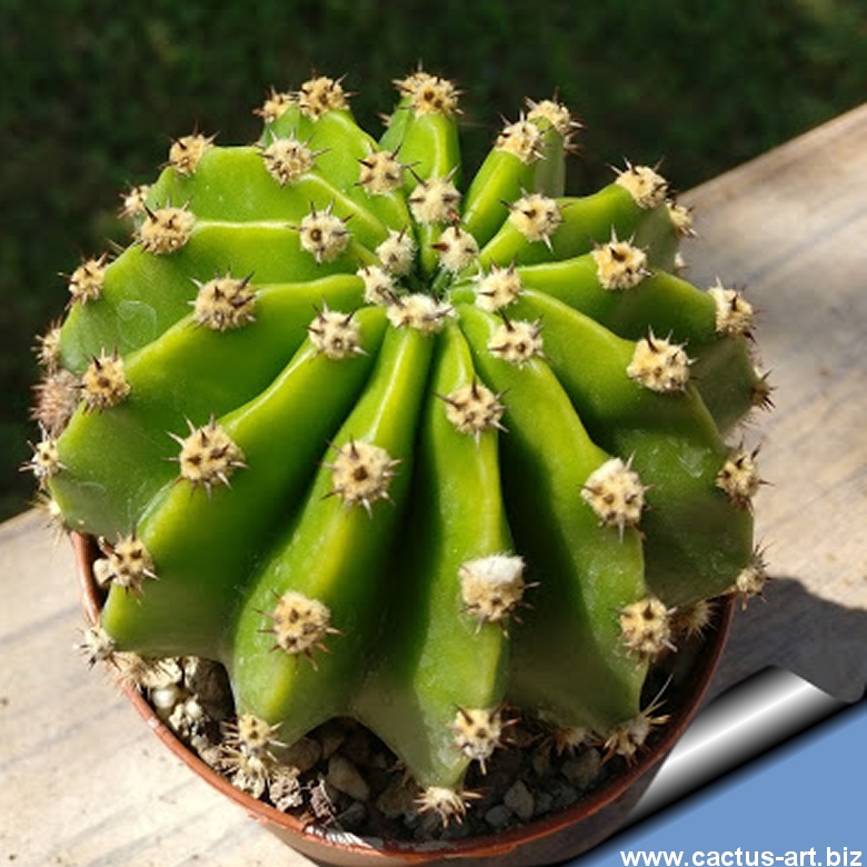 Specie accestente che sviluppa folti gruppi intorno al fusto centrale. Corpo globoso, verde scuro, con costole marcate e spine brevi. Produce grandi fiori bianchi a tromba, oltre 20 cm, con fioriture ripetute dalla primavera all’estate.