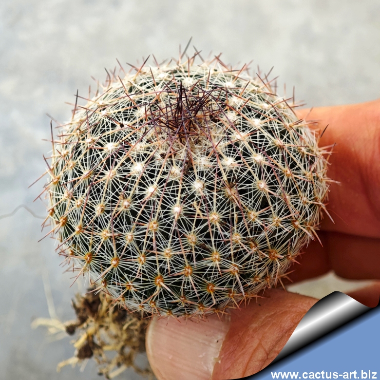 Cactus globulare o leggermente ovoidale con spine dritte, rigide e ordinate in spirali regolari, bianco cenere, grigie o beige chiaro, con le più lunghe dotate di punte bruno-rossastre o nero-rossastre. I fiori variano dal bianco puro al rosa tenue o lilla chiaro.