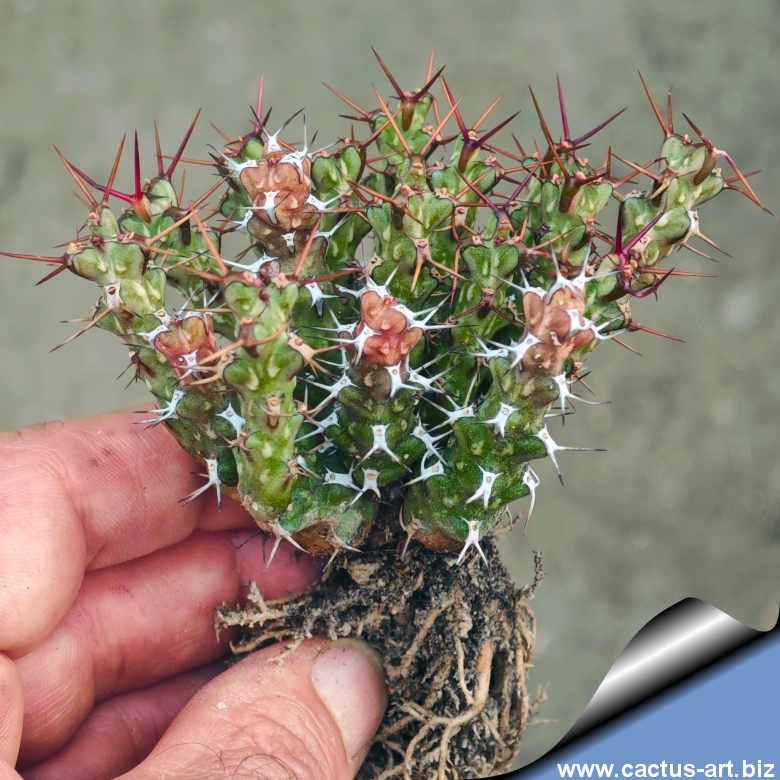 Piccola Euphorbia che forma cespugli spinosi alti fino a 10 cm e larghi 50 cm. Fusti verdi, sottili ed eretti, con tubercoli evidenti e spine rigide, appuntite, grigio-marroni.