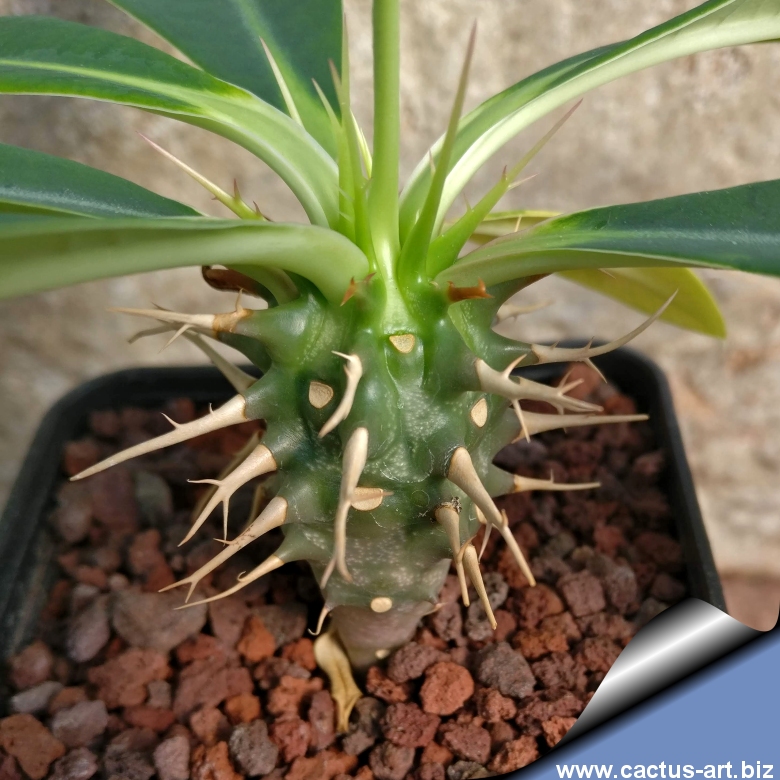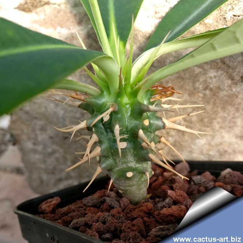 Succulenta endemica delle foreste costiere del Madagascar. Presenta fusti angolosi verde brillante con spine bianche spiralate. Produce infiorescenze rosse vivaci. Crescita lenta, con fusti che sviluppano texture uniche dopo la caduta delle foglie.