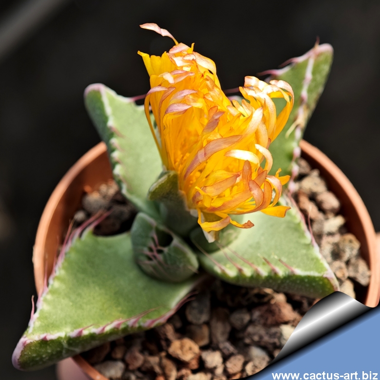 Rosette basse e aperte di foglie carnose e larghe, cosparse di fini puntini grigio scuro; bordi con bande cornee bianche o rossastre e prominenti ricurvi simili a peli, particolarmente evidenti. Producono grandi fiori giallo-dorati con bordi rosati.