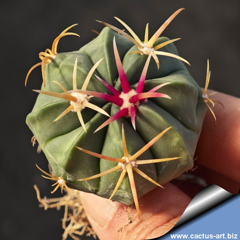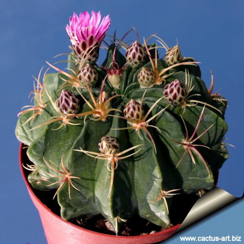 Chiamato anche “Candy Cactus”, Ferocactus macrodiscus è un cactus a botte di dimensioni medie, con fusto appiattito blu-verde. Cresce rapidamente da seme e fiorisce già a pochi centimetri di diametro. I fiori sono bianchi con petali striatidi viola.
