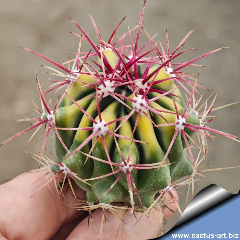 Giovani piante di Ferocactus con variegature gialle, bianche o rosa (specie e ibridi vari). Ogni esemplare è diverso, con variegature e colori unici. Tutti esemplari interessanti e speciali.