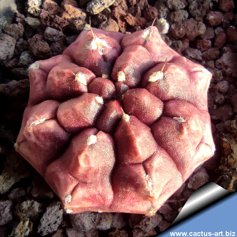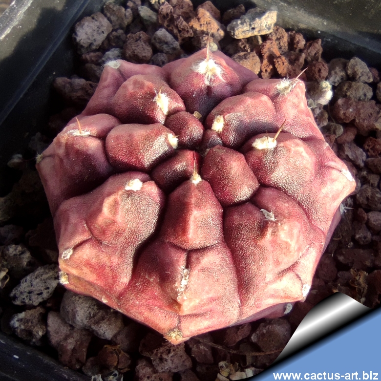 "DAY DREAM" is one of the most sought after Gymnocalycium cultivars. The compact, thornless body is very dark purple. Transversal strips of emerald green on the ribs create an extraordinary contrast of colors. Beautiful. If exposed to the sun it will tend to have a more homogeneous color.