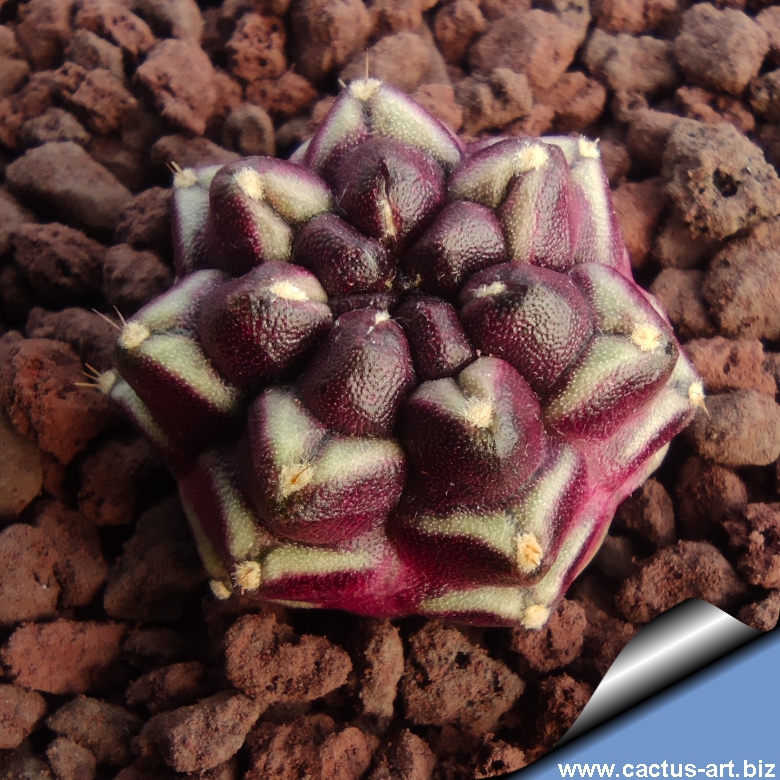 "DAY DREAM" is one of the most sought after Gymnocalycium cultivars. The thornless body is dark purple. Transversal strips of emerald green on the ribs create an extraordinary contrast. If exposed to the sun it will tend to have a more homogeneous color.