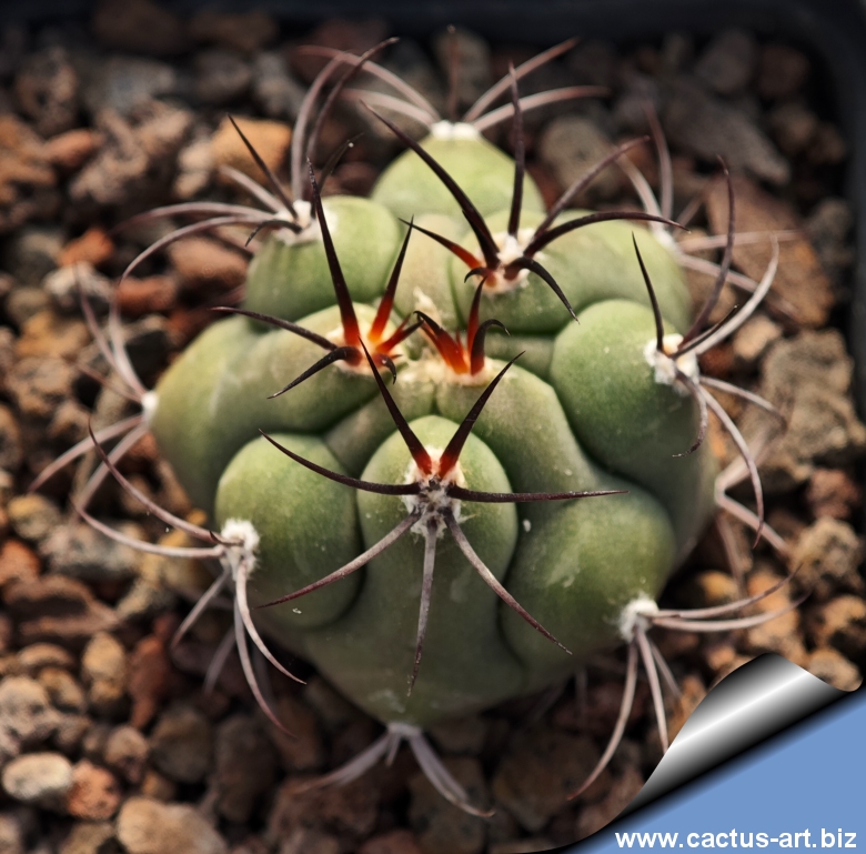 Cactus di media grandezza con teste verde opaco e spine robuste e ricurve. Fiori di colore variabile, solitamente pesca, molto decorativi. I semi minuscoli richiedono semina in vaso chiuso, mantenendo umidità per almeno un anno. La pazienza è ricompensata.