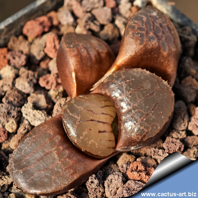 Magnifico ibrido fra H. springbokvlakensis × H. comptoniana con foglie grasse e traslucide, solcate da venature mogano che disegnano mappe segrete. Eredita la lentezza di crescita dei genitori. Una sfera di vetro botanico che cattura la luce.