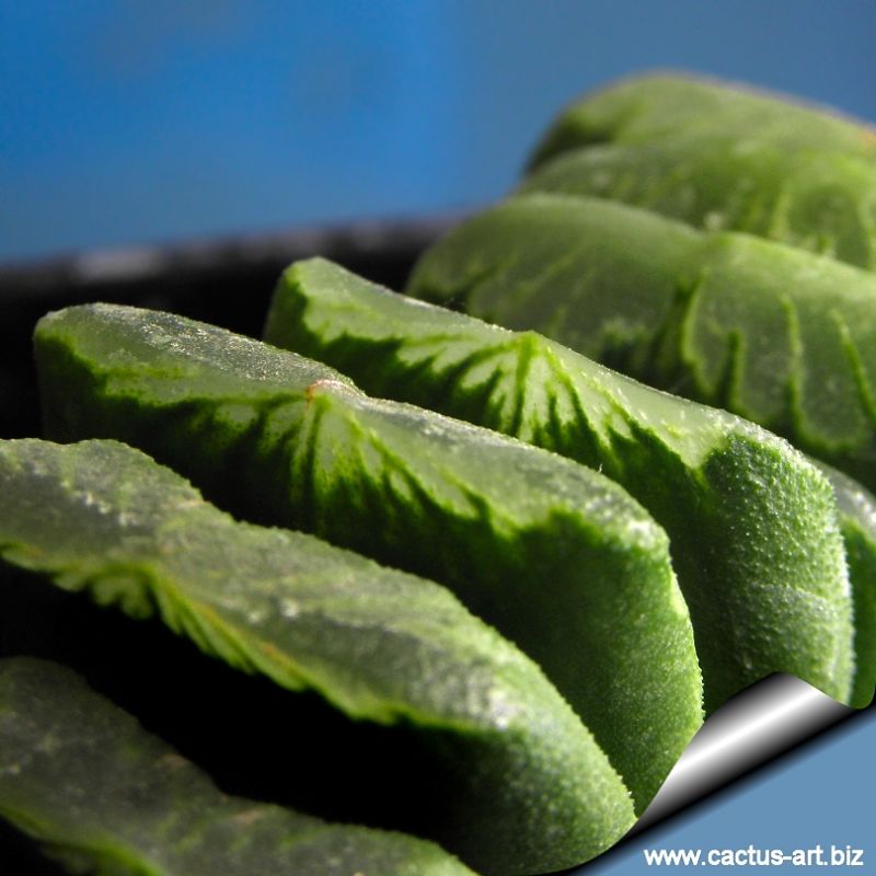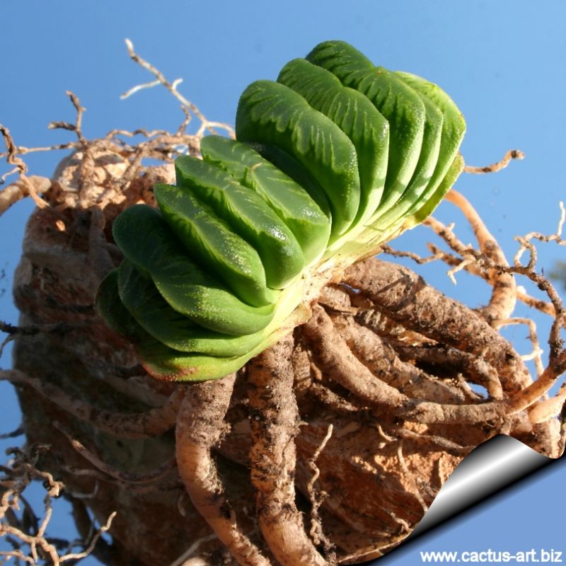 | Cultivation: Easy to grow it need regular water but do not water again until dry. Also, it is a species that is dormant in the winter and require very little water (maybe even none) during the cold months. Frost Tolerance: Light frost protection required. Minimum of 5ºC for safe growing (but hardy up to -5°C or less.) Sun Exposure: Requires light shade to bright light (protect from strong midday sun). In shade the body colour will remain mostly green, while full sun will darkena bit. Can be sunburned if moved from shade/greenhouse into full sun too quickly. The amount of sunlight it can withstand without scorching depends upon the how hot it becomes in the summer in the locale in which it is planted. During the spring it may be able to take full sun until the heat arrives at the end of spring. In an area that has hot afternoon sun, it may be able to take full morning sun, but requires afternoon shade or afternoon light shade. Offsets readily. Needs a deep pot to accommodate the long, thick, contractile roots. Propagation: Offsets that appear at the base between the leaves; leave them attached to form a cluster, or wait until they are 1/3 the size of the parent and then detach and plant. | |