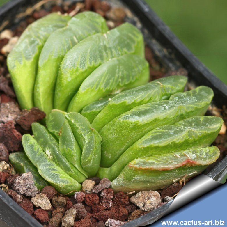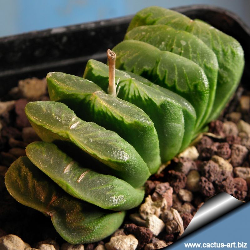 | Description: “Lime green” is a very nice hybrid, characterized by broad squared-off leaves with the typical fan-like leaf arrangement of H. truncata and ability to form nice clumps. It seems to be an hybrid between H. truncata and H. cuspidata (or perhaps H. cymbiformis) | |
