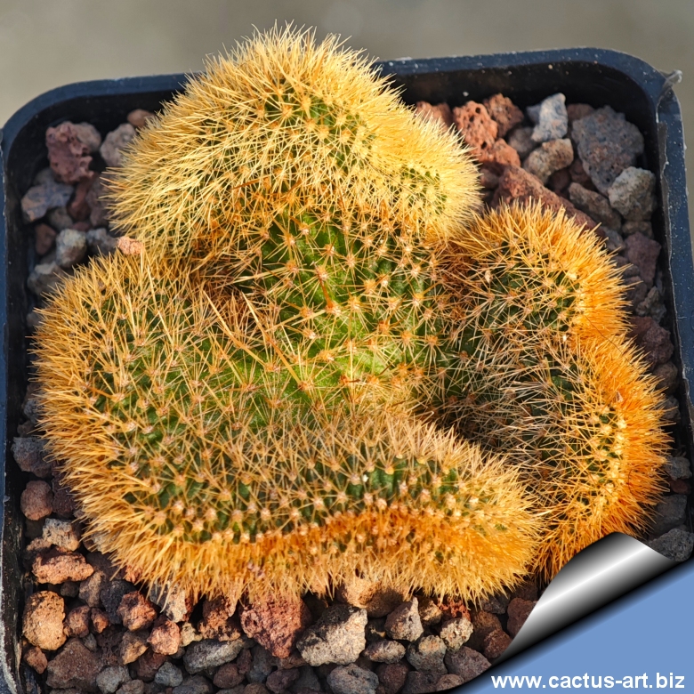 Forma crestata della Hildewintera aureispina, con fusti sottili e ondulati ricoperti da fitte spine giallo-arancio, corte e setolose. Cresce rapidamente formando ampi cuscini dorati dall’aspetto molto ornamentale.