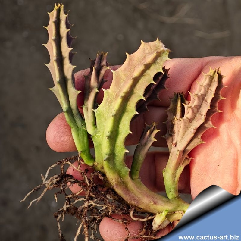 Huernia hislopii subsp. robusta assomiglia alla forma tipica, ma si distingue per fusti più robusti e fiori più grandi—fino a 5 cm di diametro! La corolla è bianca, macchiata di rosso scuro, e priva di linee concentriche alla base. RARA.