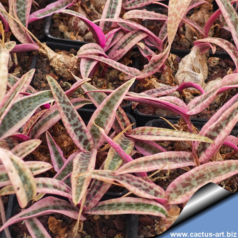 Questa bulbosa sudafricana si distingue per foglie maculate e variegate di crema e rosa. Pianta d’appartamento facile, ma richiede luce abbondante per esaltare la sua colorazione.