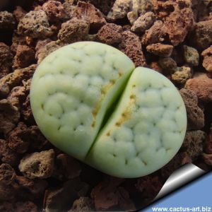 Attraente cultivar di Lithops con corpo giallo-verde chiaro fino a giallo ocra, decorato da disegni dendritici verde oliva scuro e fiori bianchi.