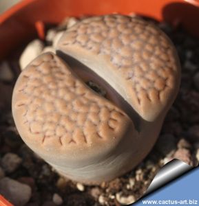 Lithops terricolor (L. localis) is a yellow- blooming living stone and is distinguished especially by the pellucid dots regularly scattered over the top surface of the leaves. It is generally smaller than most Lithops.