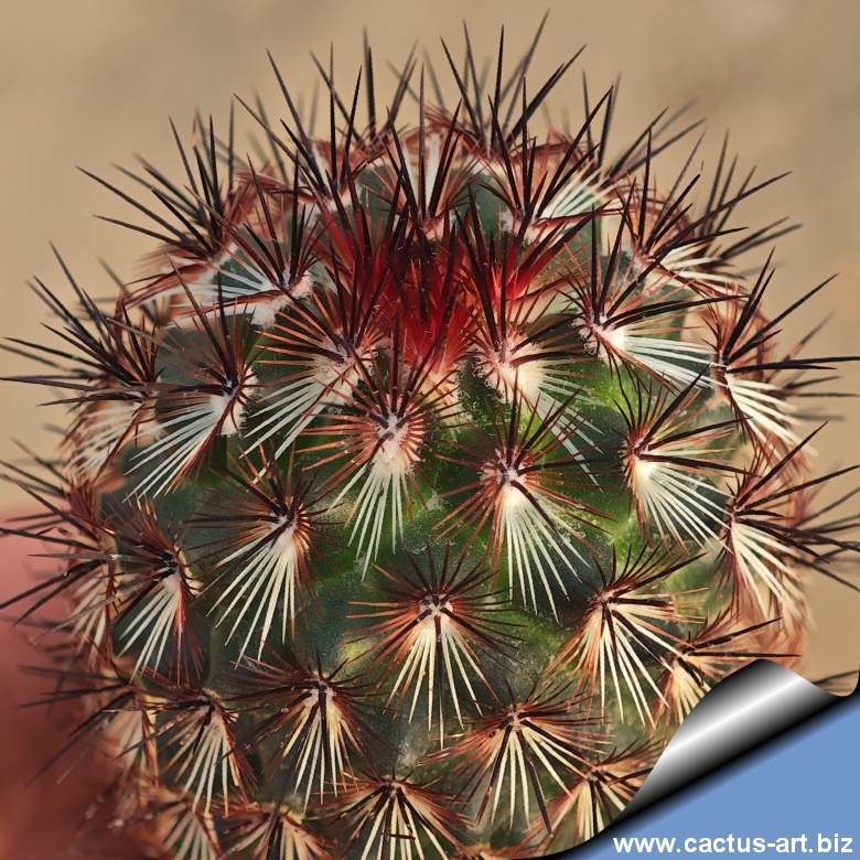 Un cactus di grande bellezza! Il corpo verde scuro fa risaltare le sue forti spine centrali da rossastro a mogano scuro e le numerosissime spine radiali sottili e color crema, disposte a raggiera. Un gioco di colori e forme davvero affascinante.