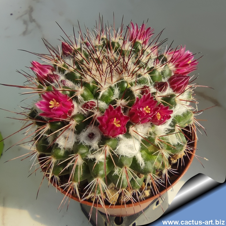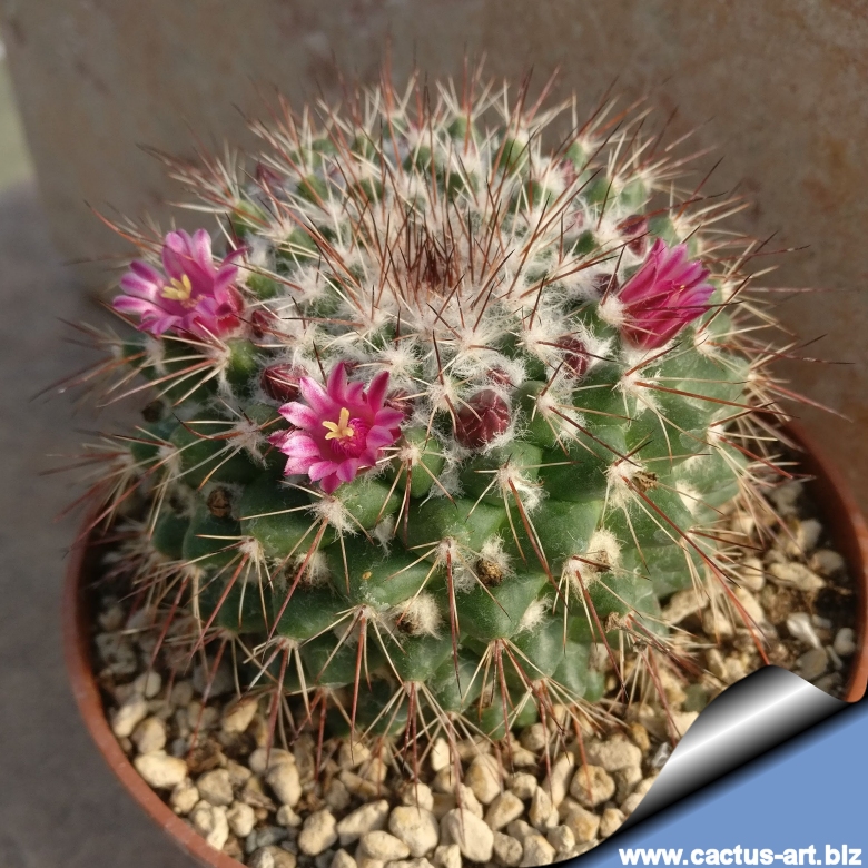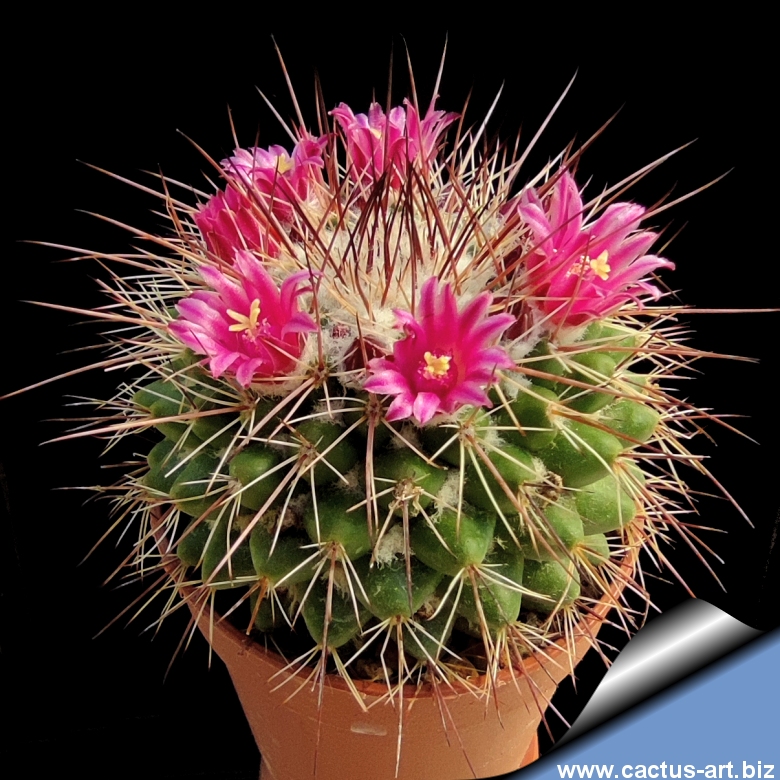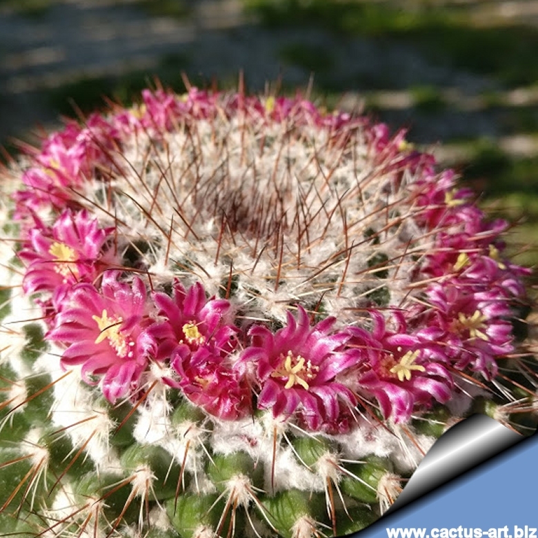 Cactus rotondo e simmetrico, con spine corte e dure. Piccoli fiori viola disposti in cerchio attorno all’apice del fusto.