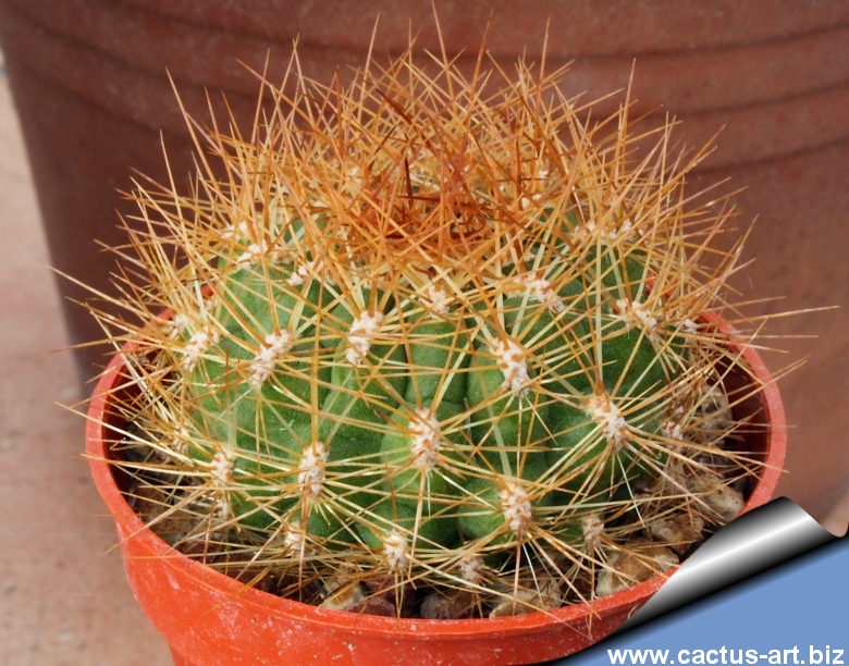 Pianta globosa con apice depresso e costole formate da tubercoli esagonali. Le fitte spine aghiformi, mostrano calde tonalità ambrate. Fiori rosso-arancio, slanciati e stretti, talvolta obliqui o debolmente zigomorfi.
