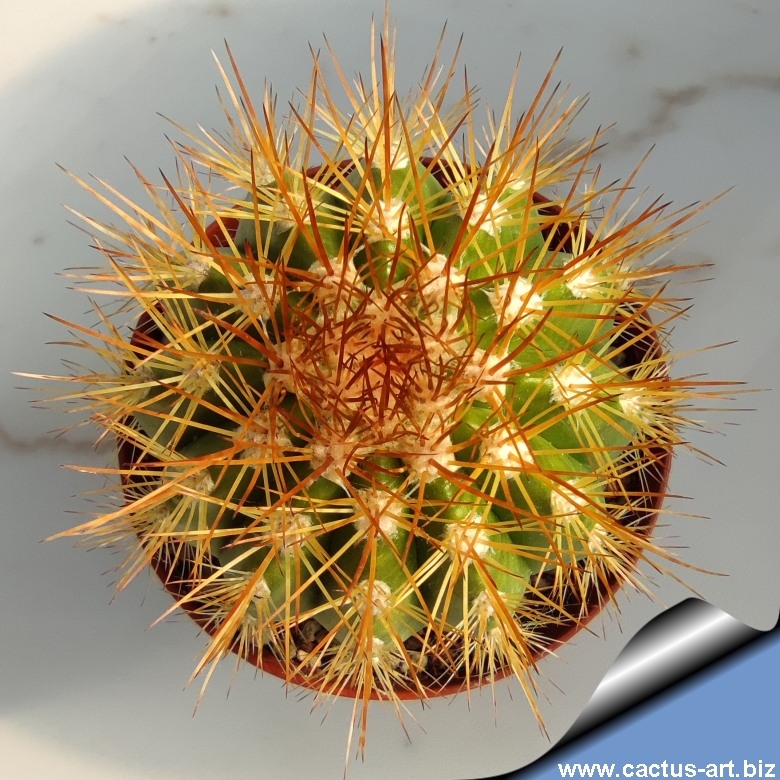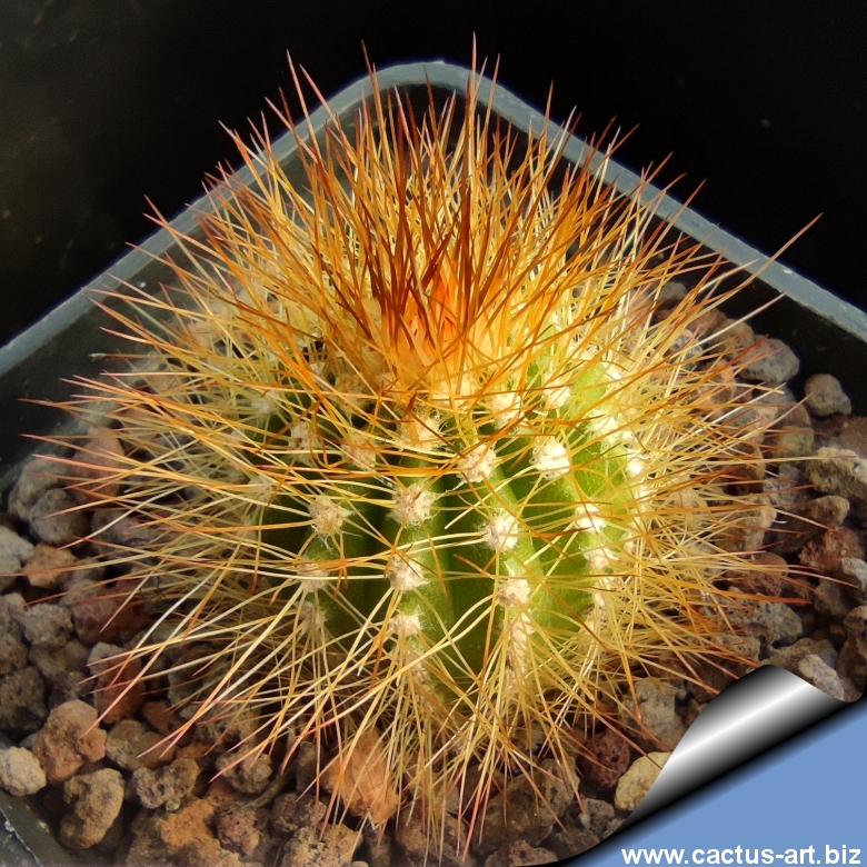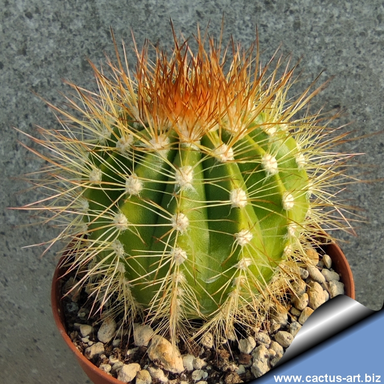 Fusti sferici o ovoidali (10-15 cm di diametro), verde-giallastri. Spine giallo-miele o brune. Il cefalio è caratterizzato da setole salmone o rosso-arancio, segno distintivo della specie.
