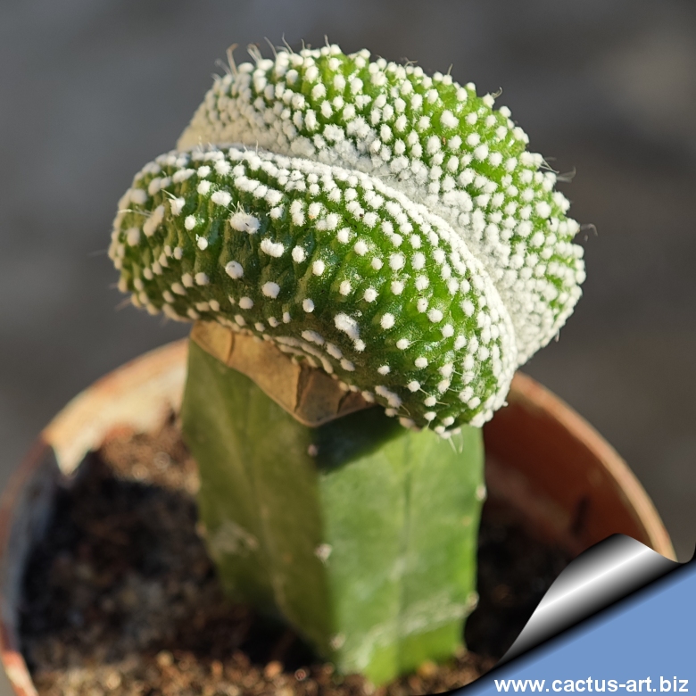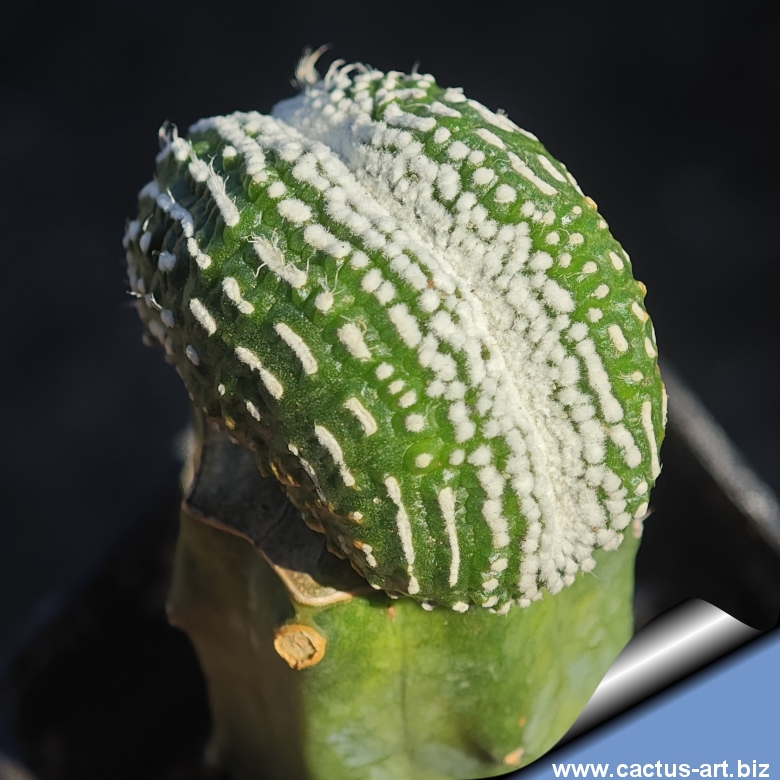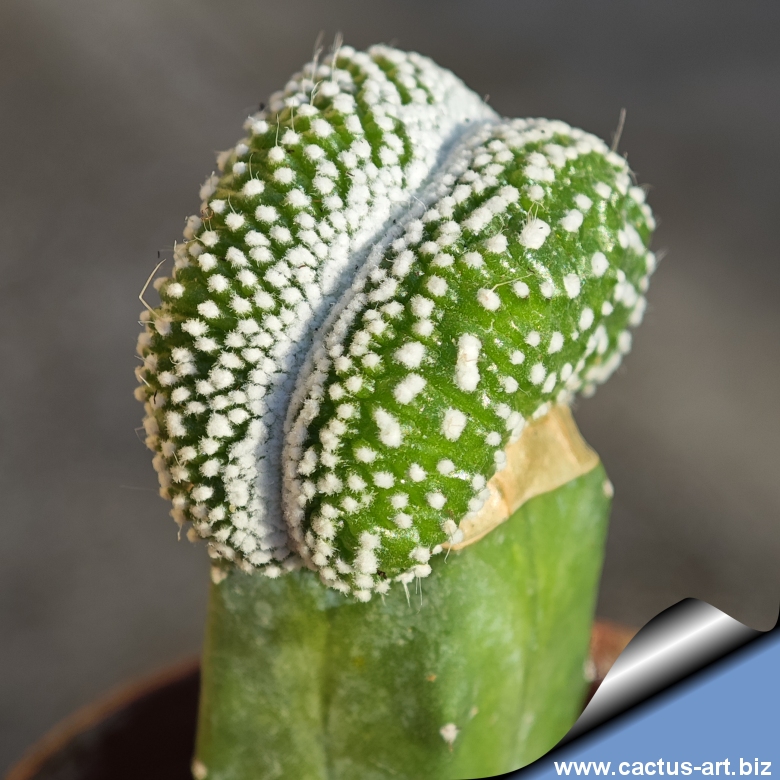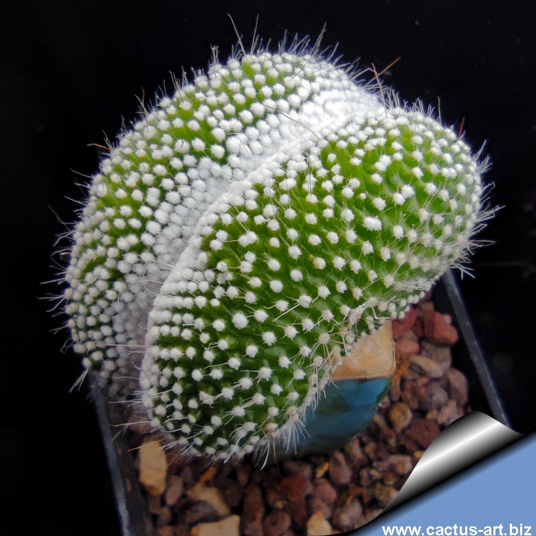 Questa è la splendida forma crestata di Notocactus scopa f. inermis: mostruosa e morbida al tatto. Quasi priva di spine, presenta areole lanose bianche disposte con perfetta simmetria lungo il corpo verde.