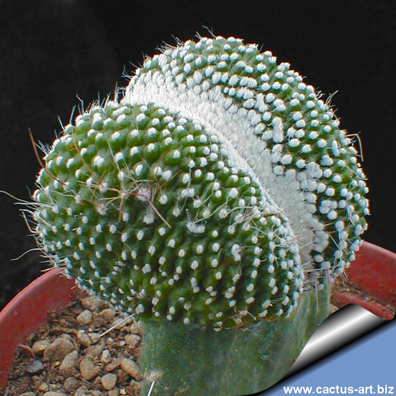 Questa è la splendida forma crestata di Notocactus scopa f. inermis: mostruosa e morbida al tatto. Quasi priva di spine, presenta areole lanose bianche disposte con perfetta simmetria lungo il corpo verde. L’effetto ondulato della cresta accentua l’eleganza di una forma già di per sé unica e scenografica.