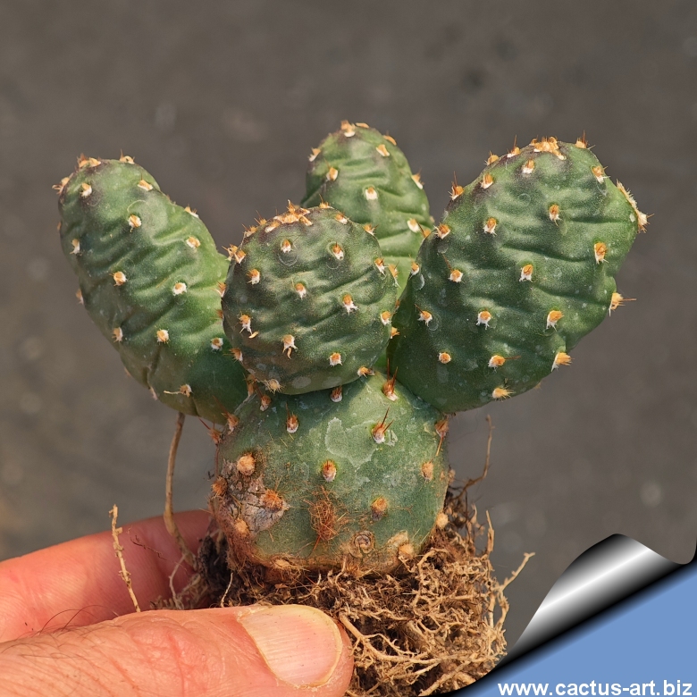 Specie compatta che forma bassi cespi di piccoli articoli ellittici o quasi sferici, verdi scuri o blu-verdi, con areole lanose marroni e sottili spine radiali gialle o rossastre. In primavera ed estate produce grandi fiori gialli.