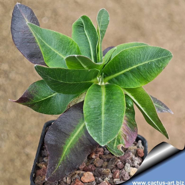 La più piccola e bizzarra specie del genere, P. brevicaule ha un caudice rugoso che ricorda un mucchio di patate. Un must per ogni collezionista di Pachypodium. È innestata su un esemplare molto basso di P. lamerei, per mantenere una forma compatta e proporzionata.