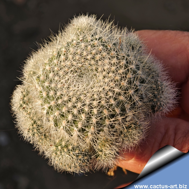 Fusti avvolti da spine bianche , setolose e traslucide. La pianta produce impressionanti fiori carminio di grandi dimensioni, che emergono verso l'esterno dai lati inferiori del fusto, creando un bellissimo contrasto.