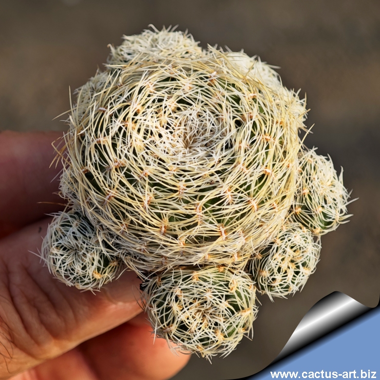 Cactus bellissimo con piccoli fusti ramificati, interamente ricoperti da fitte spine bianche e appressate, così dense da nascondere completamente il corpo. I fiori sono di un magenta brillante, molto ornamentali.