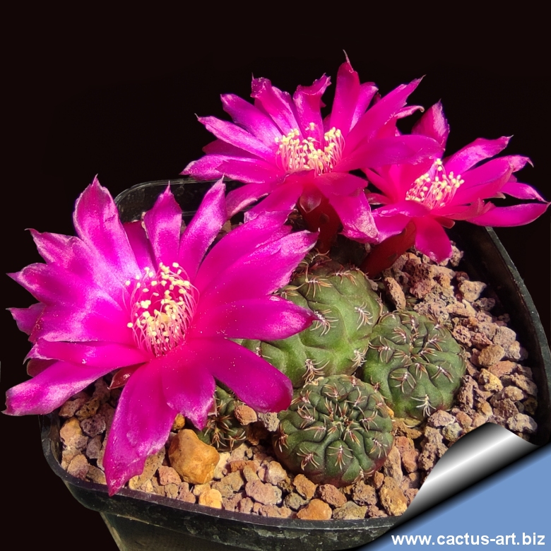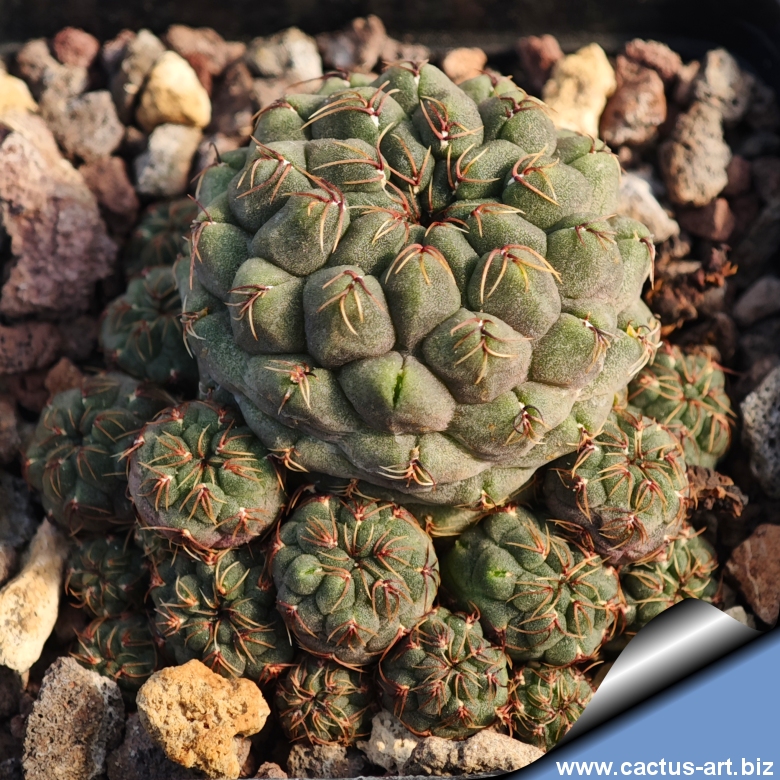 Corpo verde-grigio scuro con sfumature porpora più accentuate in pieno sole, superficie tubercolata e spine corte a lisca di pesce. Fiori alla base, a livello del suolo, in tonalità dal rosso intenso al rosa-viola.