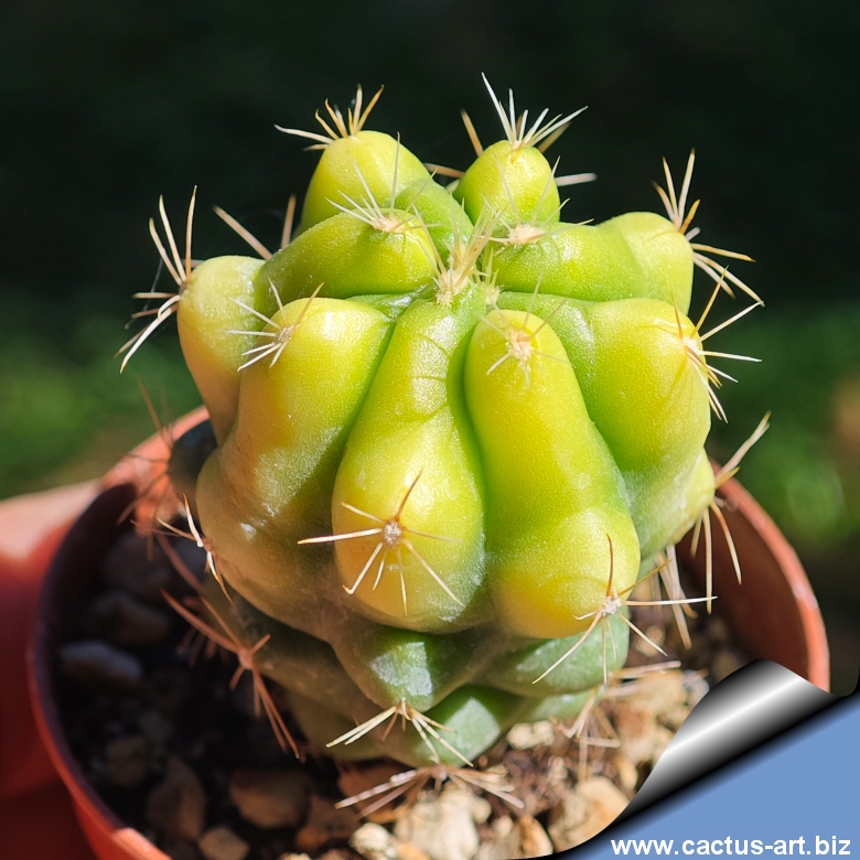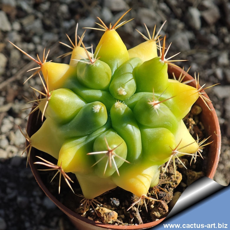 Mix di diverse specie e ibridi di Thelocactus con corpo variegato, nati da seme e accuratamente separati dagli esemplari non variegati. Il fusto mostra variegature a settori, fasce o chiazze di colore, con almeno due tonalità distinte. Le piante variegate sono altamente variabili, ciascuna con un disegno individuale e irripetibile.