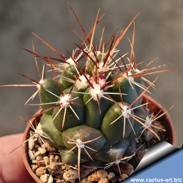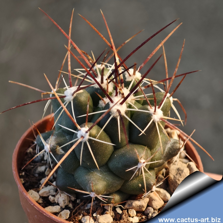 Globoso e fortemente tubercolato, questo cactus sfoggia grandi fiori gialli. Le sue spine centrali, erette e lunghe fino a 7 cm, partono giallo-rossicce o marroni per assumere una tonalità grigiastra. L’effetto cromatico in fiore è notevole.