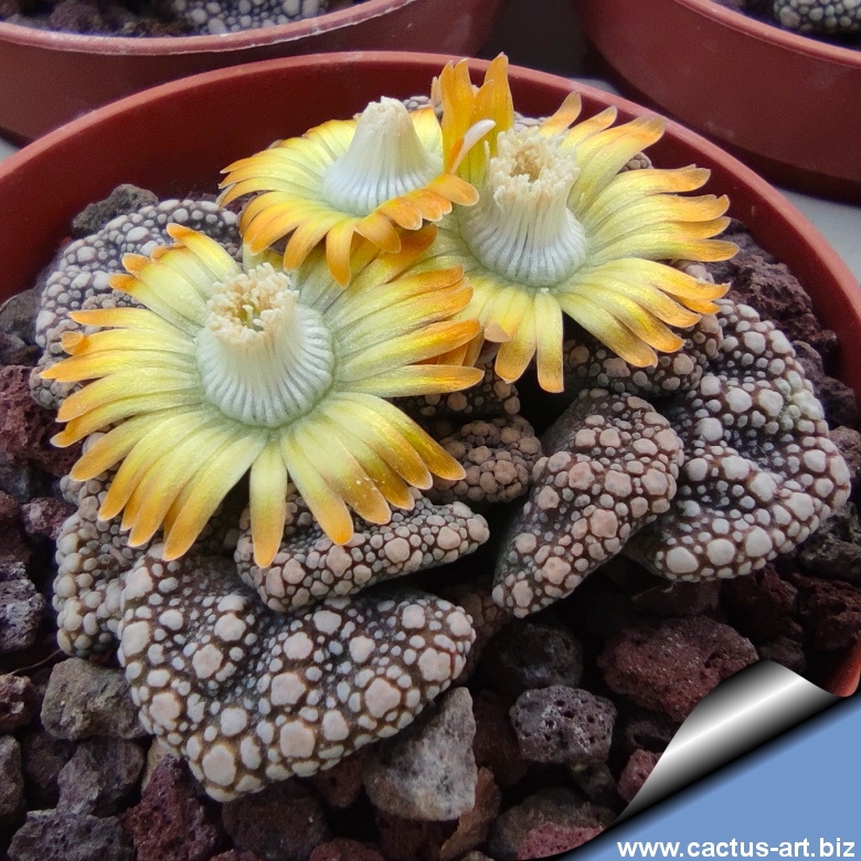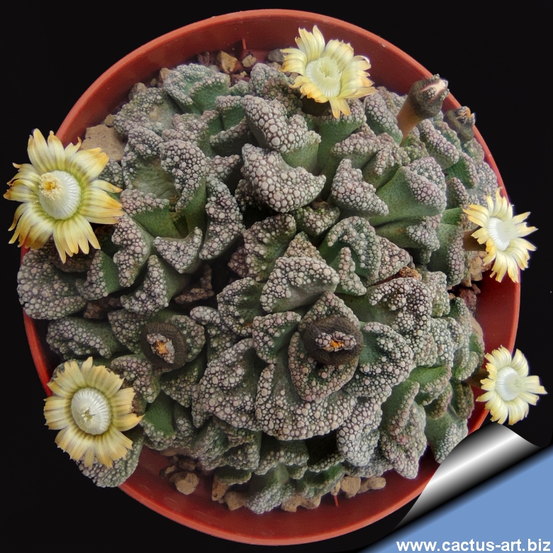 Rosette compatte con foglie grigio-azzurre o blu-verdi ornate da incrostazioni apicali variabili: bianco, grigio, ocra, rosso o blu. Specie confinata a rocce calcaree, notevole caso di colorazione protettiva che la rende mimetica.