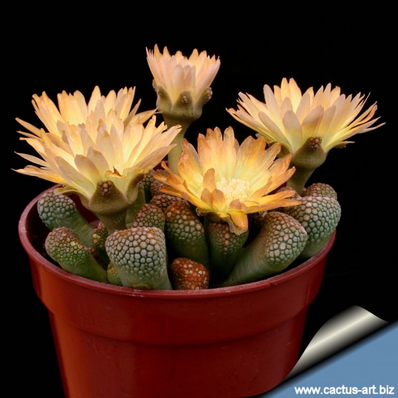 Bella succulenta  attraente fin da giovane, riconoscibile per la superficie superiore coperta di verruche regolari, bianche, grigie o beige. Fiori gialli con punte color carne. Crescita lenta ma estremamente gratificante.