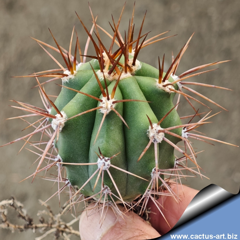 Maestosa cactacea colonnare dal fusto verde smeraldo opaco, solcato da profonde costolature. Le areole portano spine radiali biancastre e centrali giallo-grigiastre fino a 10 cm. Gli esemplari adulti regalano enormi fiori bianchi notturni, spettacolari.