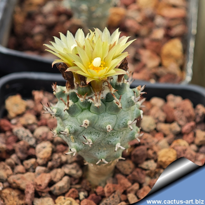 Selezione speciale del famoso Turbinicarpus flaviflorus, con spine brevissim e suberose, di colore marrone dorato. Il fusto, ricoperto in una pruina glauca tendente al bianco, risalta nettamente contro le spine tozze e calde, creando un effetto visivo raffinato e immediatamente riconoscibile.