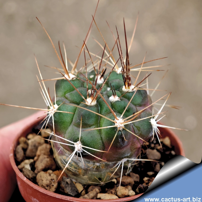 Fusto verde-giallastro con tubercoli rotondi disposti a spirale. Areole grandi e chiare. Spine numerose, aghiformi, intrecciate, lunghe fino a 5 cm, color paglia-marrone. Fiori giallo-aranciati vicino all'apice.