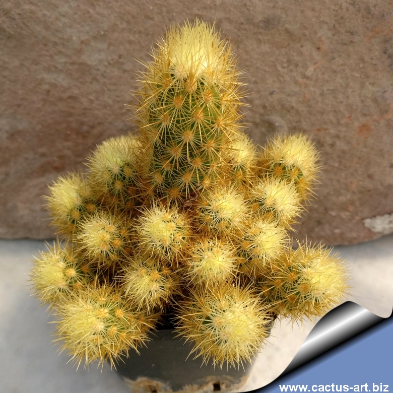 This uncommon (but very nice) cactus, has tiny finger shaped stems and will slowly form small clusters with dense golden spines. Spines are gold-amber coloured. Flowers tiny pale yellow on the apex.